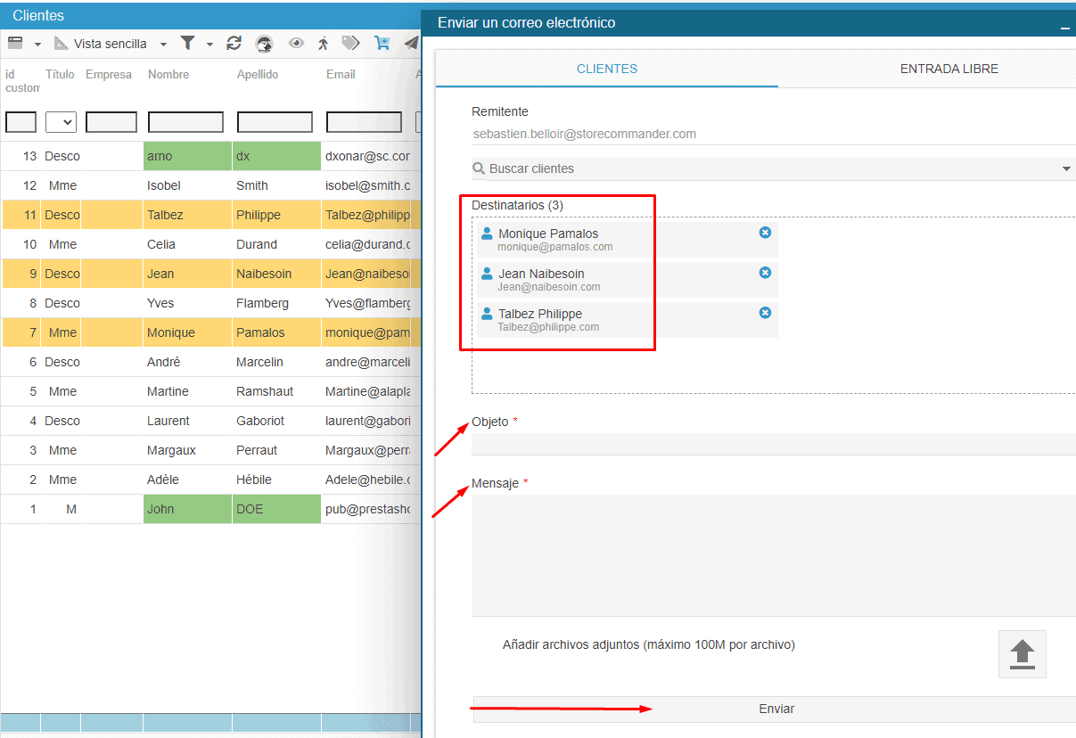 Para enviar un mensaje a una o varias personas que no forman parte de su base de clientes, utilice la pestaña "Entrada libre", para indicar los correos electrónicos de las personas en cuestión.