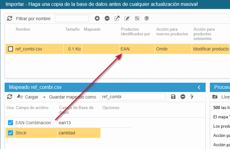 En función del identificador elegido, aquí utilizamos la referencia de las combinaciones, he aquí un ejemplo de fichero, su mapeado y las opciones a utilizar en la ventana de importación de Sc :