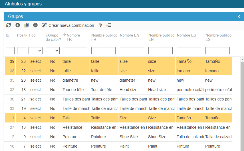 Con frecuencia ocurre que varios grupos de atributos de versiones existen duplicados o triplicados, con nombres ligeramente diferentes, como por ejemplo Talla, tallas, TALLA - visibles en la ventana de los Atributos %26 Grupos del menú Catálogo.