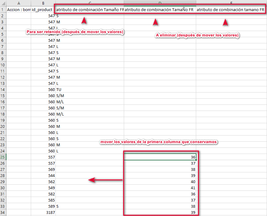 Todos los atributos que se encuentran en las columnas tallas y TALLAS deberán arrastrarse a la columna Talla que mantenemos.