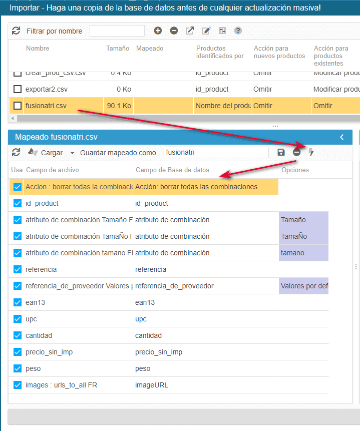 Durante el proceso de importación, las versiones de cada producto indicado en el archivo (detectado por su ID) se suprimirán y AL MISMO TIEMPO las nuevas versiones se crearán con el mismo grupo Talla, y con las mismas informaciones (referencia, cantidad, precio, etc.) que anteriormente.