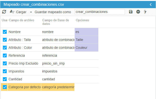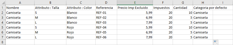 El archivo CSV debe incluir el nombre del producto y una columna para cada uno de los grupos de atributos de combinaciones. Las celdas contendrán el nombre de los atributos.