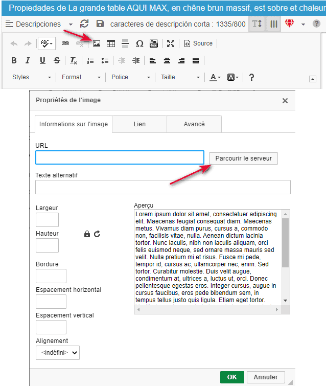 Tenga en cuenta que el copiar/pegar de imagenes directamente en la descripcion no funciona, porque las imágenes deben estar presentes en su servidor.