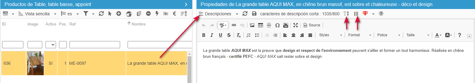 Sólo tiene que seleccionar un producto e ir a la propiedad: Descripción. Para facilitar la visualización, puede hacer clic en el icono || de la barra de herramientas. También puede ocultar la descripción breve si no la utiliza haciendo clic en el botón