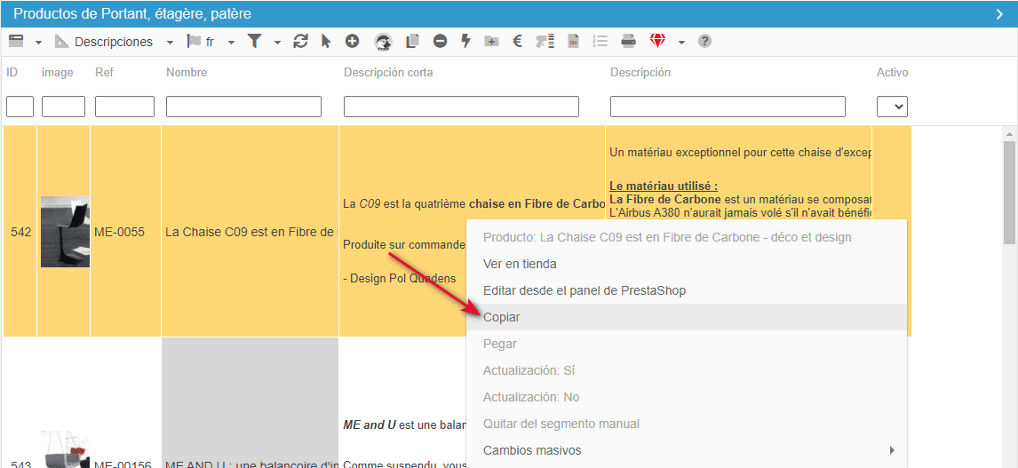 Store Commander le permite duplicar descripciones cortas y largas de un producto en varios otros productos de forma masiva gracias a su función de copiar/pegar.