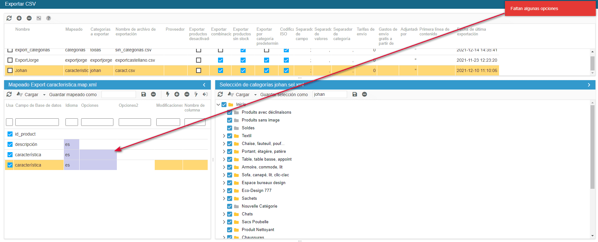 En el mapeo, hay una columna de "opciones". Para algunos campos, se requiere una opción. En este caso, la celda correspondiente tendrá un fondo de color.
