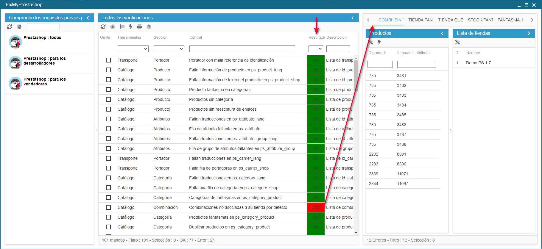 La versión extensión Store Commander (versión avanzada) le permite hacer la comprobación en uno o varios controles con solo seleccionarlos en la tabla.
