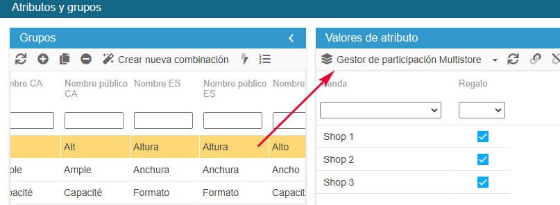 En la interfaz de Store Commander, encontrará esta opción de compartir en la tabla de los atributos de la ventana Catálogo > Atributos y Grupos > Gestión de los Atributos y Grupos