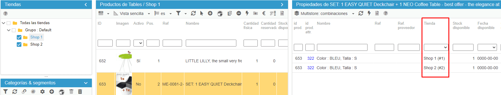 Las combinaciones pueden existir en varias tiendas y la información, como los precios y las existencias, puede ser específica de cada tienda.