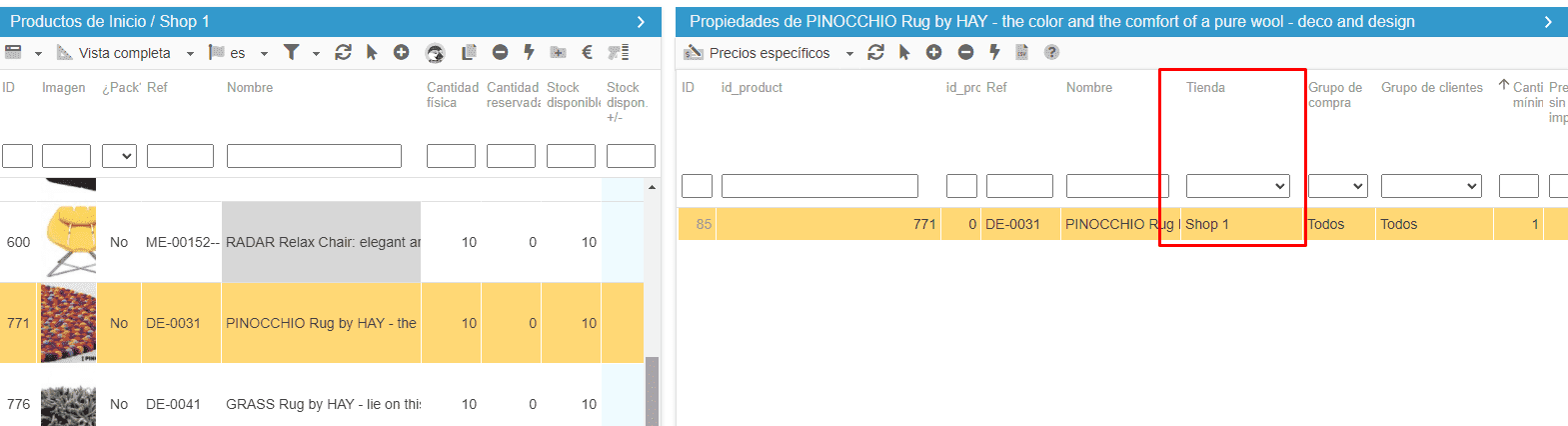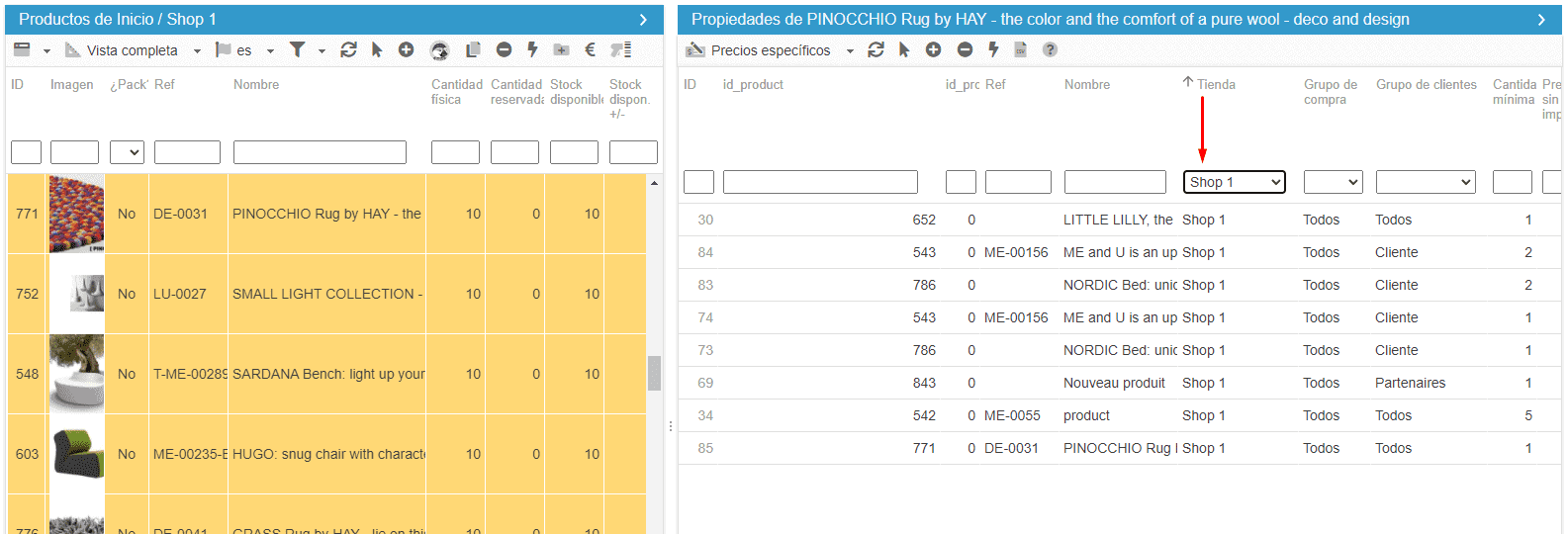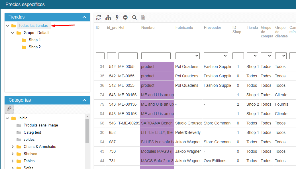 Es posible seleccionar varios productos para ver todos los precios específicos asociados, y luego filtrar por tienda para ver qué precios son específicos de una tienda.