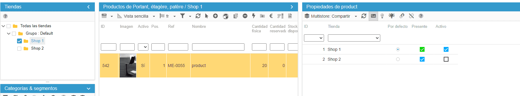 Encontrará una cuadrícula titulada Multitienda: Compartir en la columna Propiedades de la derecha que le mostrará en qué tienda(s) se encuentra un producto (seleccionado): la casilla "Presente" estará marcada.