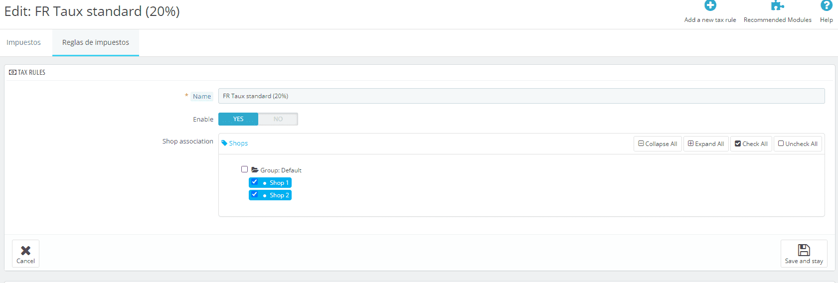 En la interfaz de Store Commander, esta regla fiscal solo estará disponible en las tiendas que acaba de vincular.