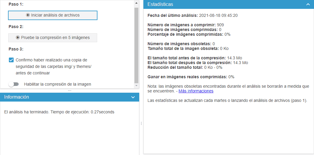 El sistema de compresión no comprime las imágenes originales que usted sube a su tienda: al usar la herramienta de regeneración de miniaturas de PrestaShop, es posible volver atrás a las imágenes de productos, categorías, etc. En cuanto a las imágenes de su tema, se recomienda hacer una copia de seguridad manual antes de activar la compresión (este recordatorio aparece justo antes del botón para activar la compresión).