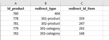 La importación de Store Commander csv le permite definir los tipos de redirecciones SEO en los productos.