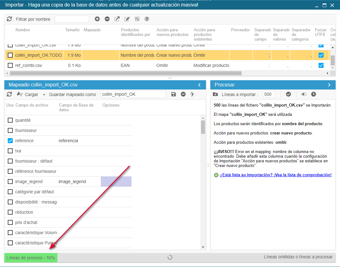 Cuando inicie la importación, verá la barra de progreso de la carga en la parte inferior de la ventana, que indica el progreso en porcentaje: