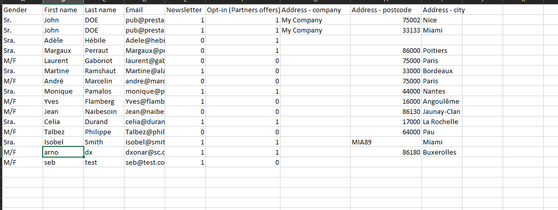 Después, una línea representa a un cliente y sus propiedades, como el género, el apellido, el nombre, el email, la empresa, la dirección, grupo de clientes, etc.