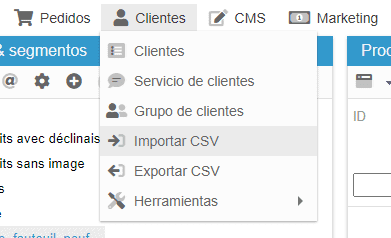 La importación CSV de clientes está accesible en el menú Clientes > Import CSV