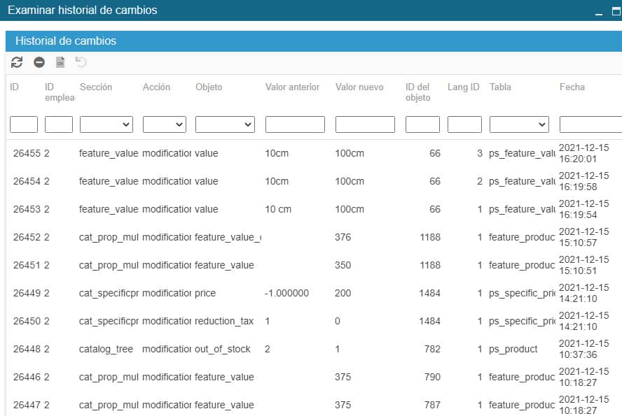 Todas las modificaciones manuales realizadas (80 %) en la interfaz de Store Commander quedan guardadas en el Historial de lcambios, accesible desde el menú Herramientas.