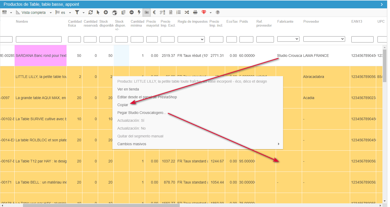 Copiar/pegar puede utilizarse para todos los campos que se encuentran en las vistas centrales de la interfaz (excepto ID e imagen), así como en algunas tablas de propiedades, como las variaciones, los precios especiales y la tabla SEO.