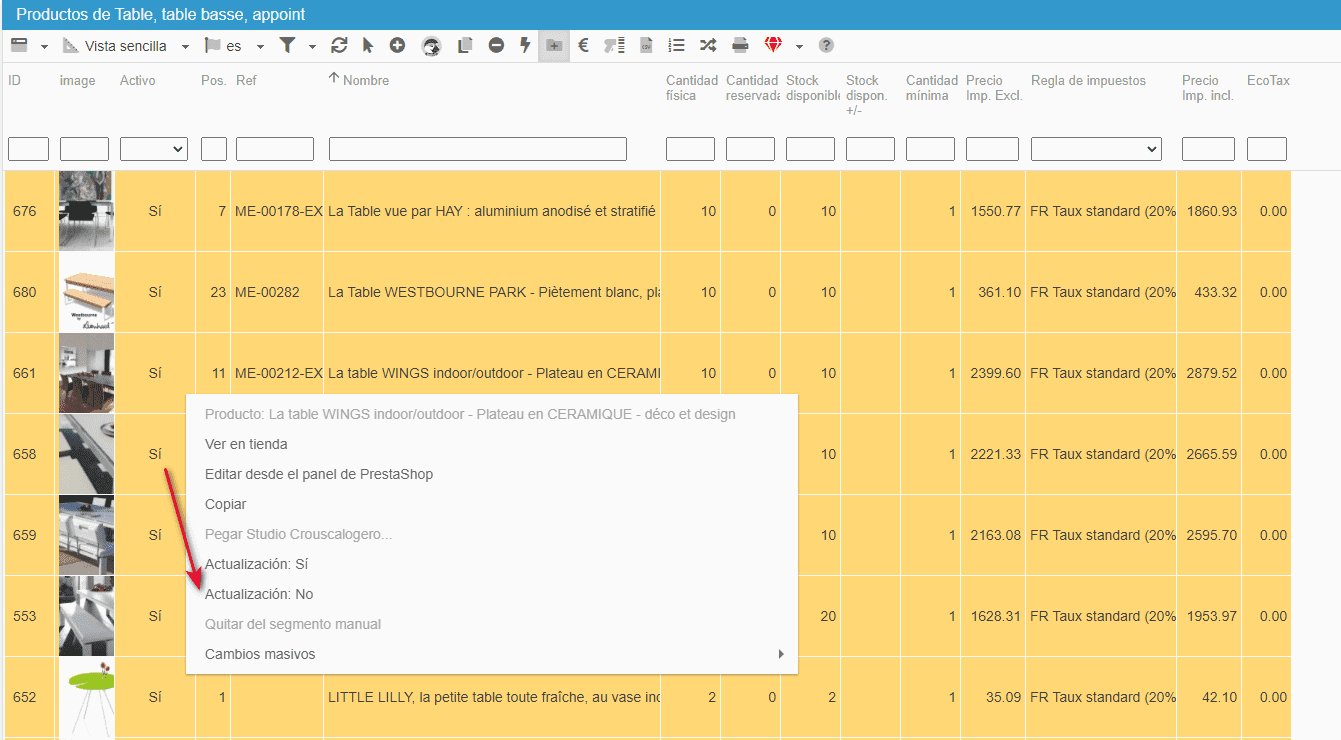 Veamos otro ejemplo. Puede activar toda una gama de productos con el mismo copiar/pegar, o incluso más rápido utilizando la opción del menú contextual "Modificación: Sí" o "Modificación: No".