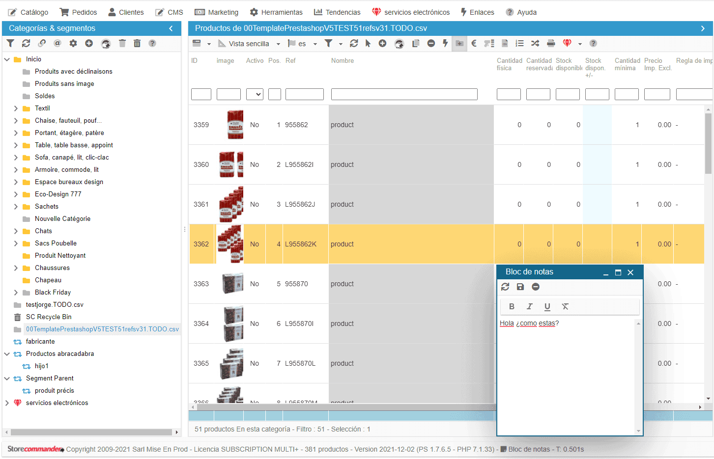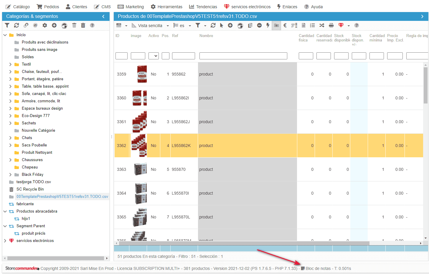 Store Commander proporciona un bloc de notas, accesible desde todas sus interfaces (Catálogo, Pedidos, Clientes, etc.) ya que se encuentra en la barra de estado en la parte inferior de la interfaz: