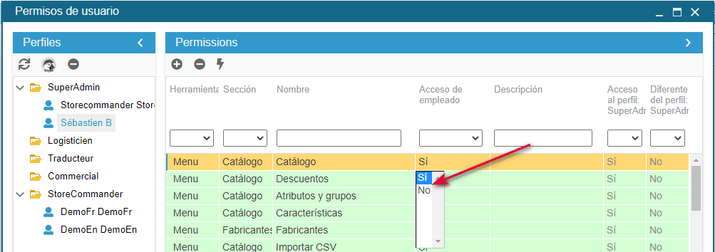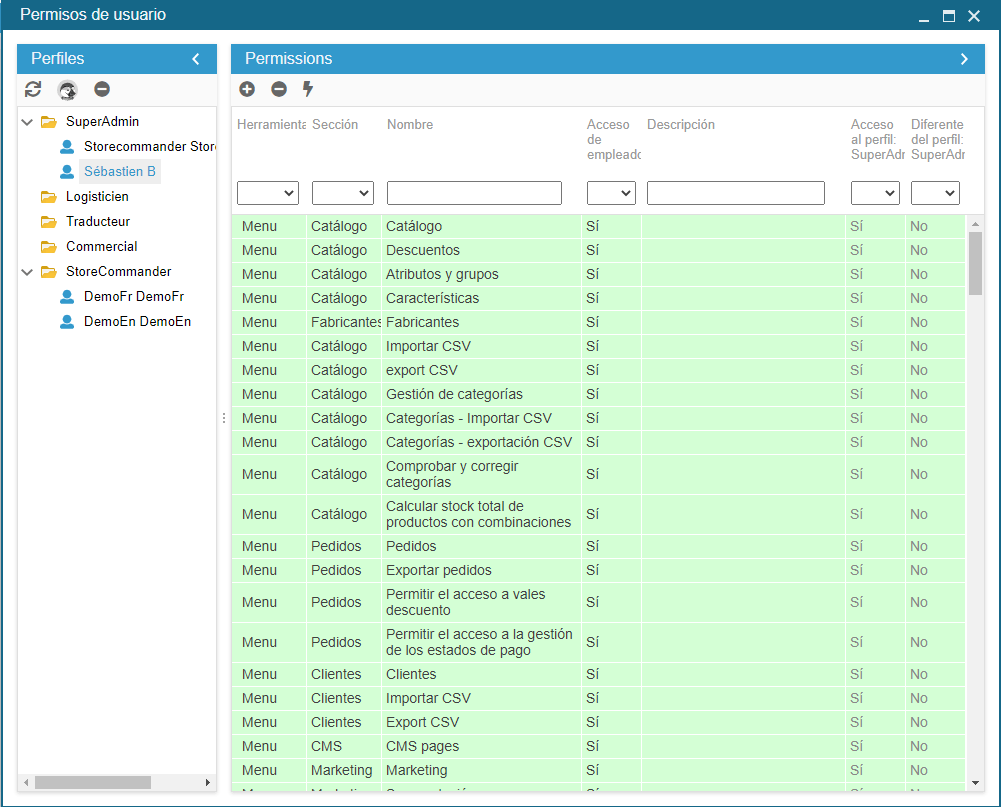 La interfaz de gestión de los permisos de los usuarios en Store Commander le permite asignar rápidamente los permisos a cada una de las personas que lo utilizan en su empresa, pero también para sus proveedores de servicios externos, como su SEO o su fotógrafo.