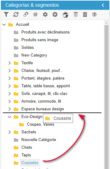 La opción de arrastrar y soltar de Store Commander le permite reorganizar rápidamente el orden de sus categorías.