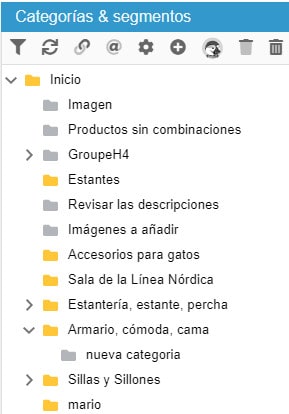 En la columna de Propiedades en las versiones de pago de Store Commander están disponibles otras funcionalidades que le permiten gestionar sus categorías más rápidamente y en masa.