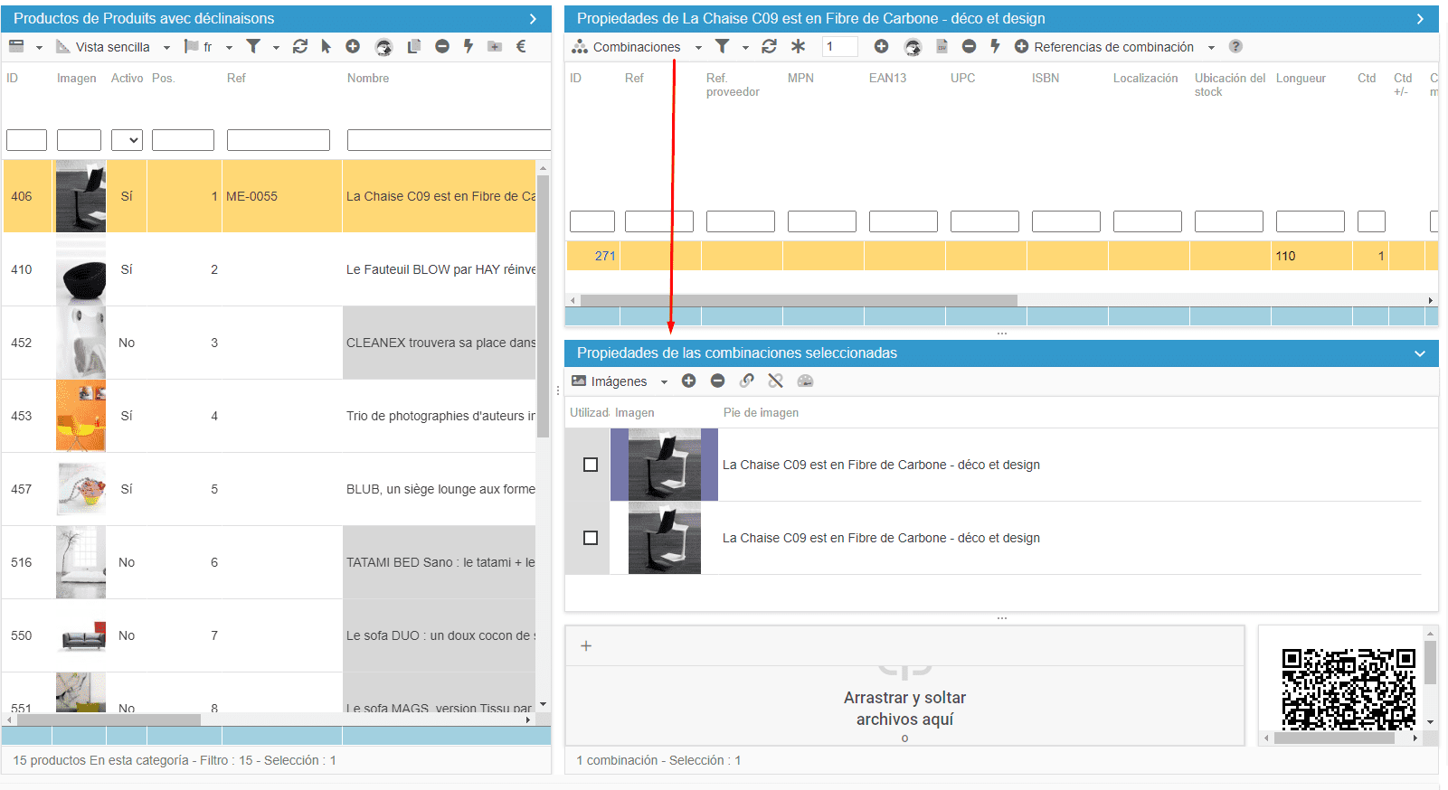 Modificar la visualización del panel de propiedades de las combinaciones