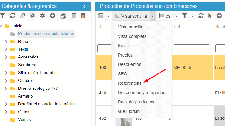 En la columna Productos, seleccione la vista "Referencias" en el menú desplegable