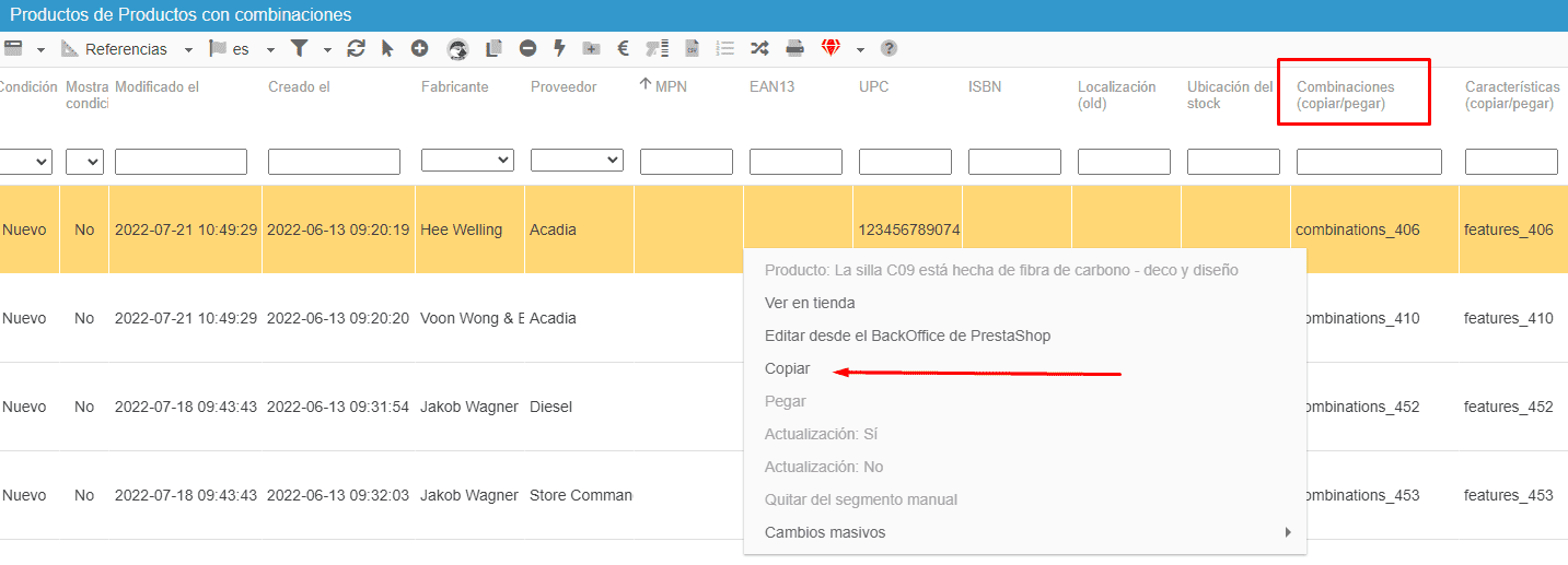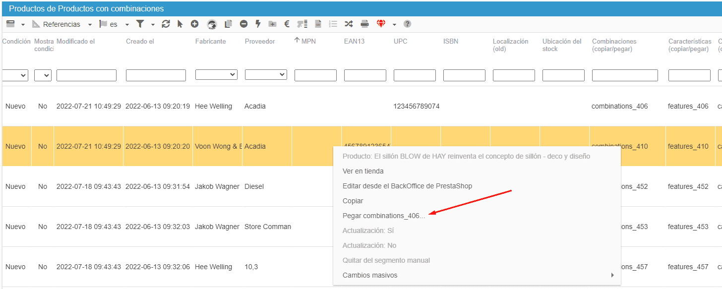 Vuelva a situar el ratón en la columna Combinaciones (copiar/pegar), haga clic con el botón derecho y seleccione "Pegar combinaciones_xxx".