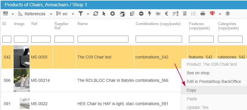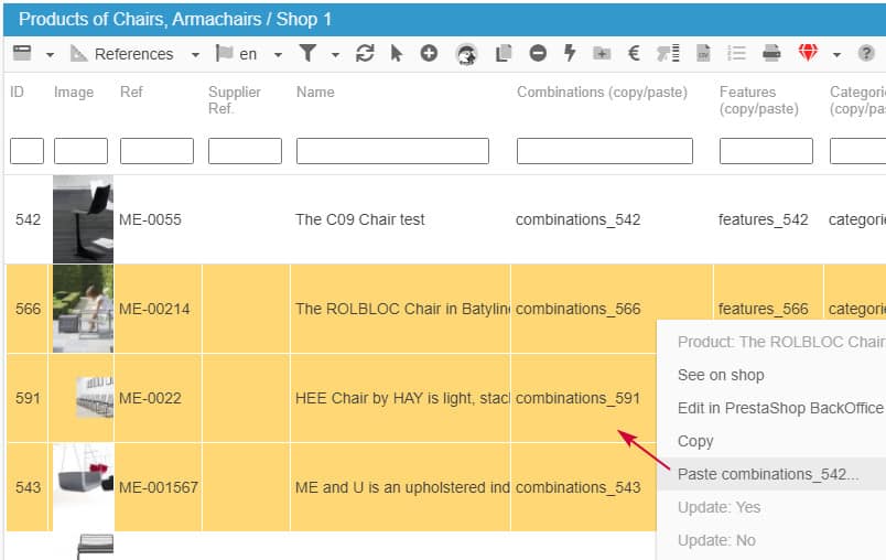 A continuación, seleccione los demás productos > haga clic con el botón derecho del ratón > pegar 'combinaciones_xx' => ¡listo!