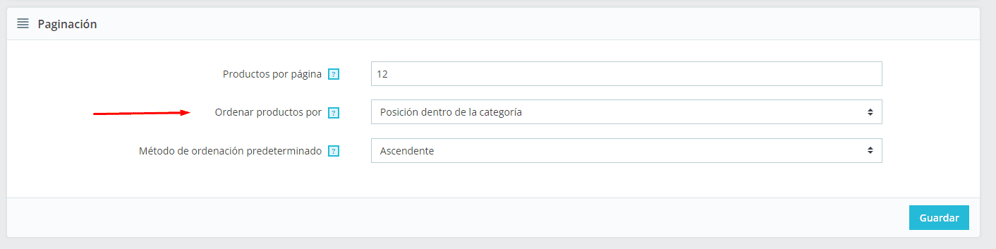 Para poder utilizar las posiciones de los productos, la opción "Ordenación por defecto" debe estar configurada como "Posición en la categoría".