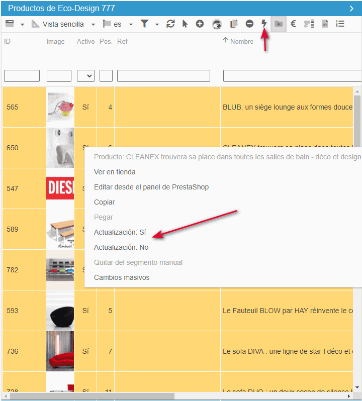 , para tener en cuenta todos los productos y, a continuación, haga clic con el botón derecho del ratón en la columna Activo > Actualizacion: Sí