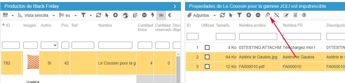Para vincular documentos adjuntos a sus productos, seleccione primero los productos y luego marque las casillas correspondientes, o bien seleccione las líneas de los documentos que quiere vincular y haga clic en el icono de vinculación en masa