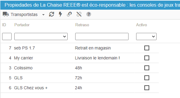 La gestión de los transportadores en Store Commander se encuentra en la tabla Transportadores de la columna de las Propiedades, a la derecha.