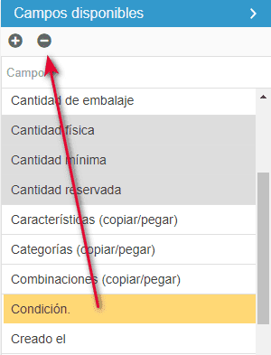 Ha modificado un campo existente y quiere restablecerlo a su valor por defecto.Para ello, selecciónelo en la lista de campos disponibles (columna de la derecha) y haga clic en el botón  en la barra de herramientas
