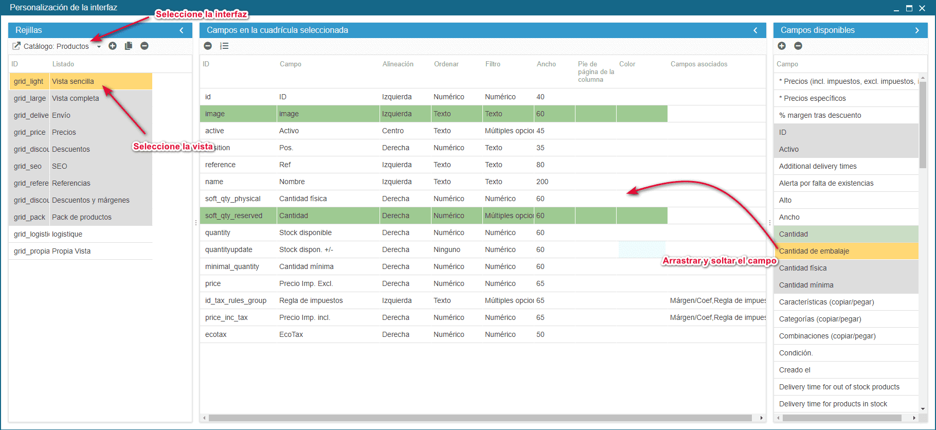 La versión clásica del módulo de personalización de la interfaz le permite añadir campos que ya están disponibles en diferentes vistas y cuadrículas de la interfaz de Store Commander.