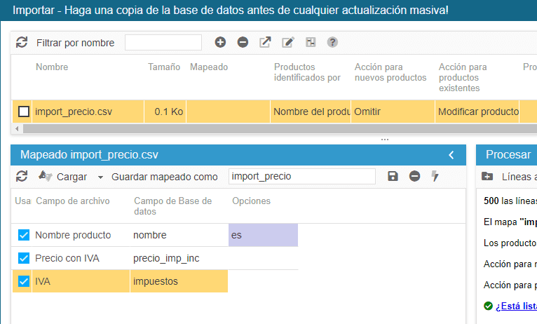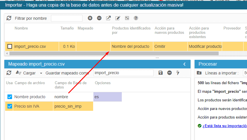Dependiendo del identificador elegido (aquí utilizamos el nombre del producto), este es un ejemplo de un archivo, su mapping y las opciones que se pueden utilizar en la ventana de importación de Store Commander: