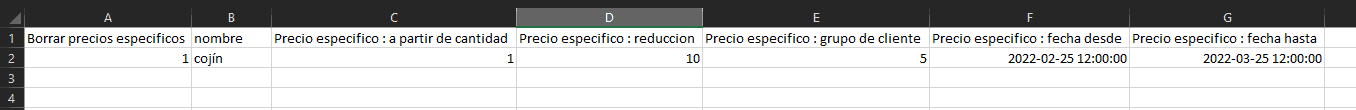 El orden de las columnas es primordial. La supresión debe tener lugar antes de importar nuevos precios específicos, por lo que la columna "suprimir los precios específicos" debe situarse antes de la que contiene los nuevos precios.