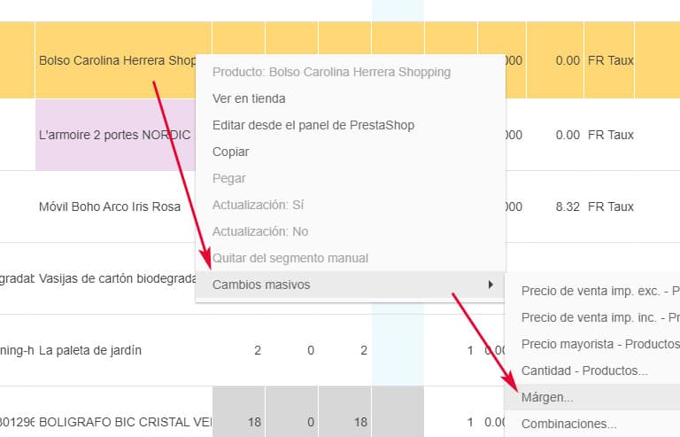 Tenga en cuenta que el cálculo no se aplicará a los productos que tienen versiones. Para modificar el margen de sus versiones, utilice la opción del menú emergente > Versiones > Margen.