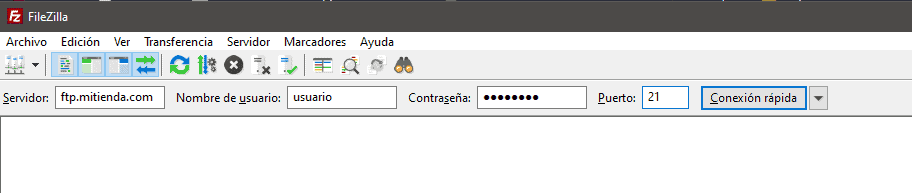 En la barra de conexión, introduzca la dirección FTP de su tienda, el nombre de usuario y la contraseña para conectarse a su web