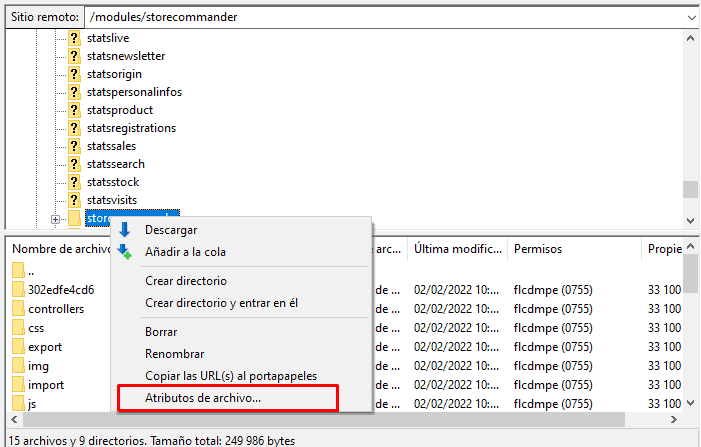 Modificar los permisos de archivos y carpetas de Store Commander con Filezilla