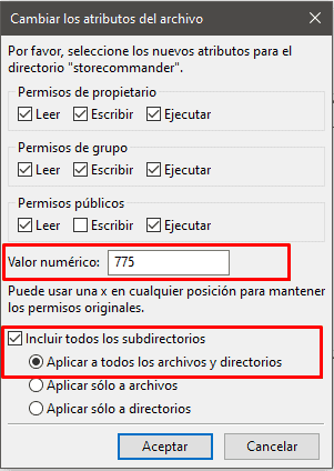 Una vez aceptadas las modificaciones anteriores, los permisos se aplicarán a cada carpeta y cada archivo contenido en el directorio /storecommander/.