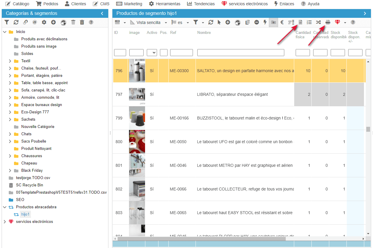Sus segmentos creados están presentes en las interfaces de Sc (catálogo, pedidos, clientes) y su contenido se muestra en una de las rejillas centrales (vista rápida, resumen, etc).