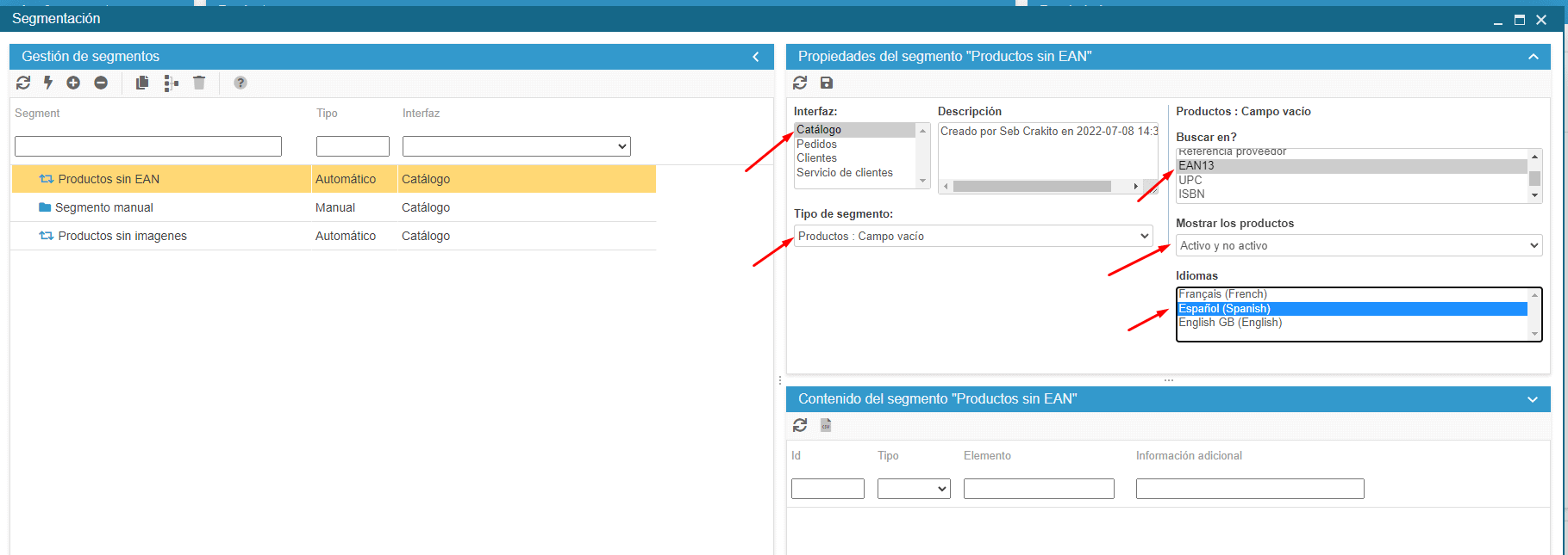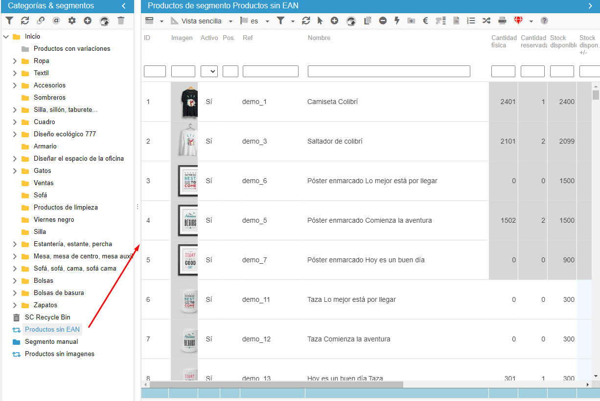 Al seleccionar este segmento obtendrá la lista de productos con el campo EAN13 vacío.