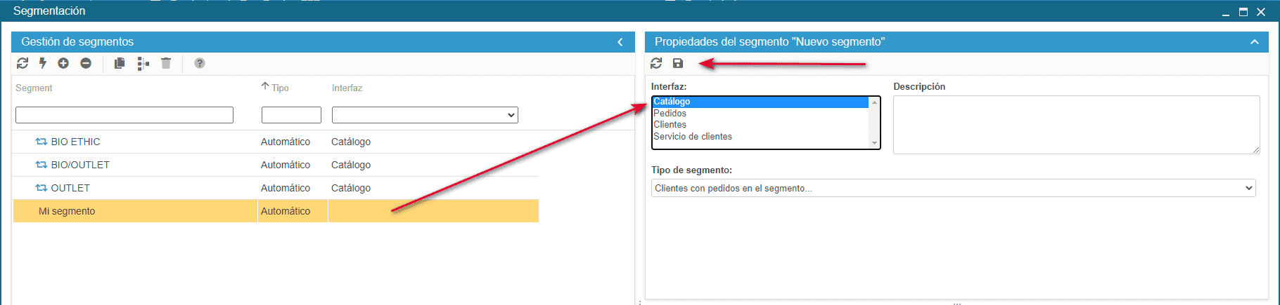 Compruebe que la interfaz en cuestión está asociada a este segmento y, si no lo está, selecciónela y guárdela en la sección de la derecha.