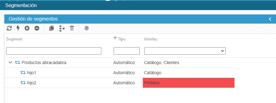 En este ejemplo, el segmento hijo (Abracadabra Commands) está asociado a la interfaz Commands, que no está asociada al segmento padre (Abracadabra Products).