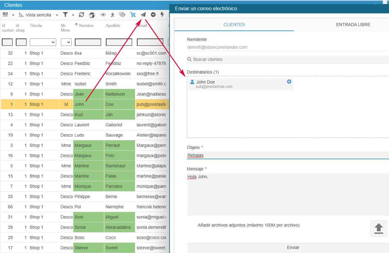Puede enviar mensajes a sus clientes directamente desde la interfaz de Servicio al Cliente de Store Commander, accesible en el menú Clientes.