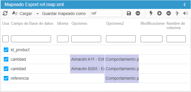 El nombre del almacén debe seleccionarse en la columna Opciones del mapeado.